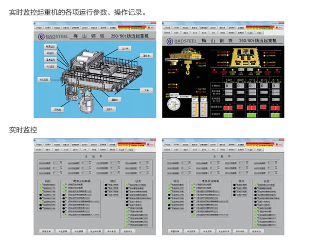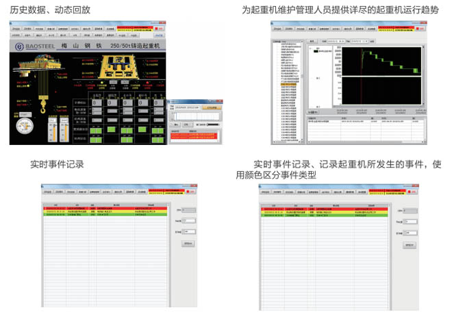 •-1、起重機(jī)狀態(tài)實時監(jiān)測:對事故易發(fā)設(shè)備和重點關(guān)鍵設(shè)備的運(yùn)行情況進(jìn)行實時監(jiān)測,同時 對采集的數(shù)據(jù)進(jìn)行分析整理,并把現(xiàn)場的實際數(shù)據(jù)與相關(guān)的設(shè)備運(yùn)行指標(biāo)進(jìn)行對比,超過偏 差限制時產(chǎn)生報警信息并存儲報警記錄。共享相關(guān)數(shù)據(jù),為及時發(fā)現(xiàn)和消除設(shè)備故障隱患提 供必要的數(shù)據(jù)支持。
