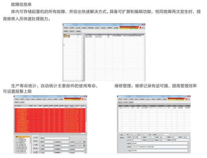 AGF系列起重機(jī)械安全監(jiān)控管理系統(tǒng)是我公司自主開發(fā)研制的產(chǎn)品,按照國質(zhì)檢特聯(lián)【2011】137號文件的要求,嚴(yán)格執(zhí)行國標(biāo):GB/T 28264-2017生產(chǎn),廣泛用于各行業(yè)大型起重設(shè)備機(jī)械、提升機(jī)、架橋機(jī)、港機(jī)、工程機(jī)械等,系統(tǒng)是為各種起重機(jī)的運(yùn)行監(jiān)視、診斷分析、設(shè)備預(yù)警與檢修維護(hù)而搭建的信息系統(tǒng)管理平臺。系統(tǒng)實時記錄起重機(jī)的運(yùn)行參數(shù)、操作記錄,當(dāng)滿足故障條件和設(shè)置預(yù)警值時,系統(tǒng)及時提醒和記錄各種事件信息,為起重機(jī)的操作人員和維護(hù)人員提供實時的、詳盡的歷史數(shù)據(jù)和分析報表。起重機(jī)安全監(jiān)控管理系統(tǒng)具有可靠穩(wěn)定性、靈活交互性、便捷易用性,是集實時監(jiān)控﹑故障報警﹑數(shù)據(jù)登錄﹑設(shè)備維護(hù)﹑運(yùn)行統(tǒng)計于一體的現(xiàn)代起重機(jī)綜合信息管理平臺。
